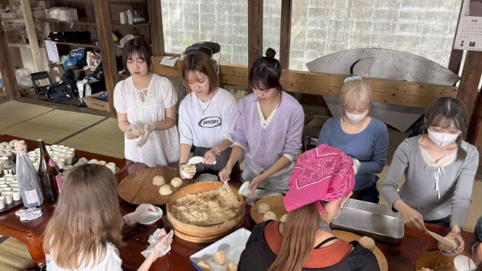 女子学生4名が塩、しょうゆ、ゆかりおにぎりを世話人会の